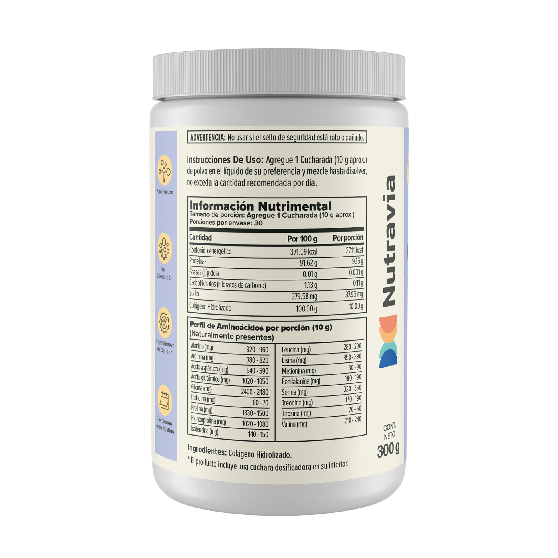 Collagen Peptides de Nutravia, esta diseñada para nutrir y revitalizar desde el interior. Cada porción de éste producto incluye 10 g de colágeno hidrolizado tipo I y III. Actuando como soporte de salud y apariencia de la piel, el cabello y las uñas. Además de brindar efectos benéficos en procesos de envejecimiento y salud articular y ósea. Fórmula de alta absorción verificada por laboratorio, sin ingredientes extras ni rellenos, sin alergénicos o trazas.