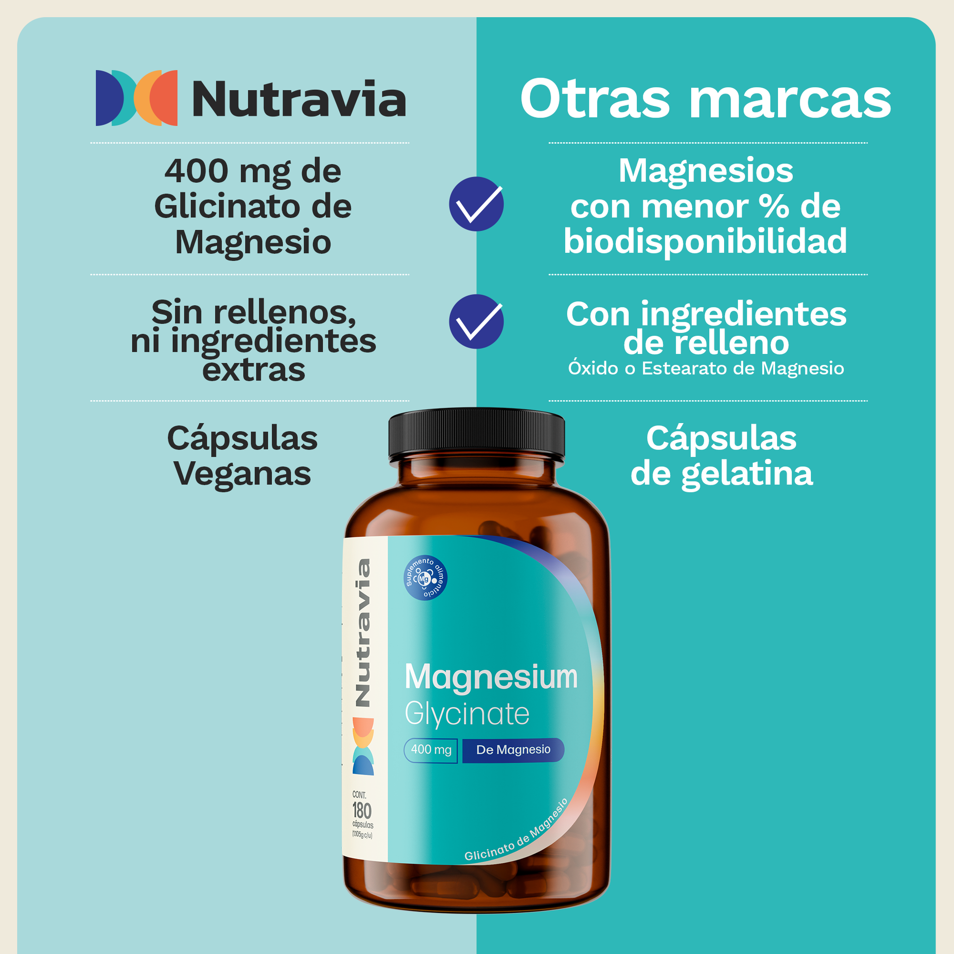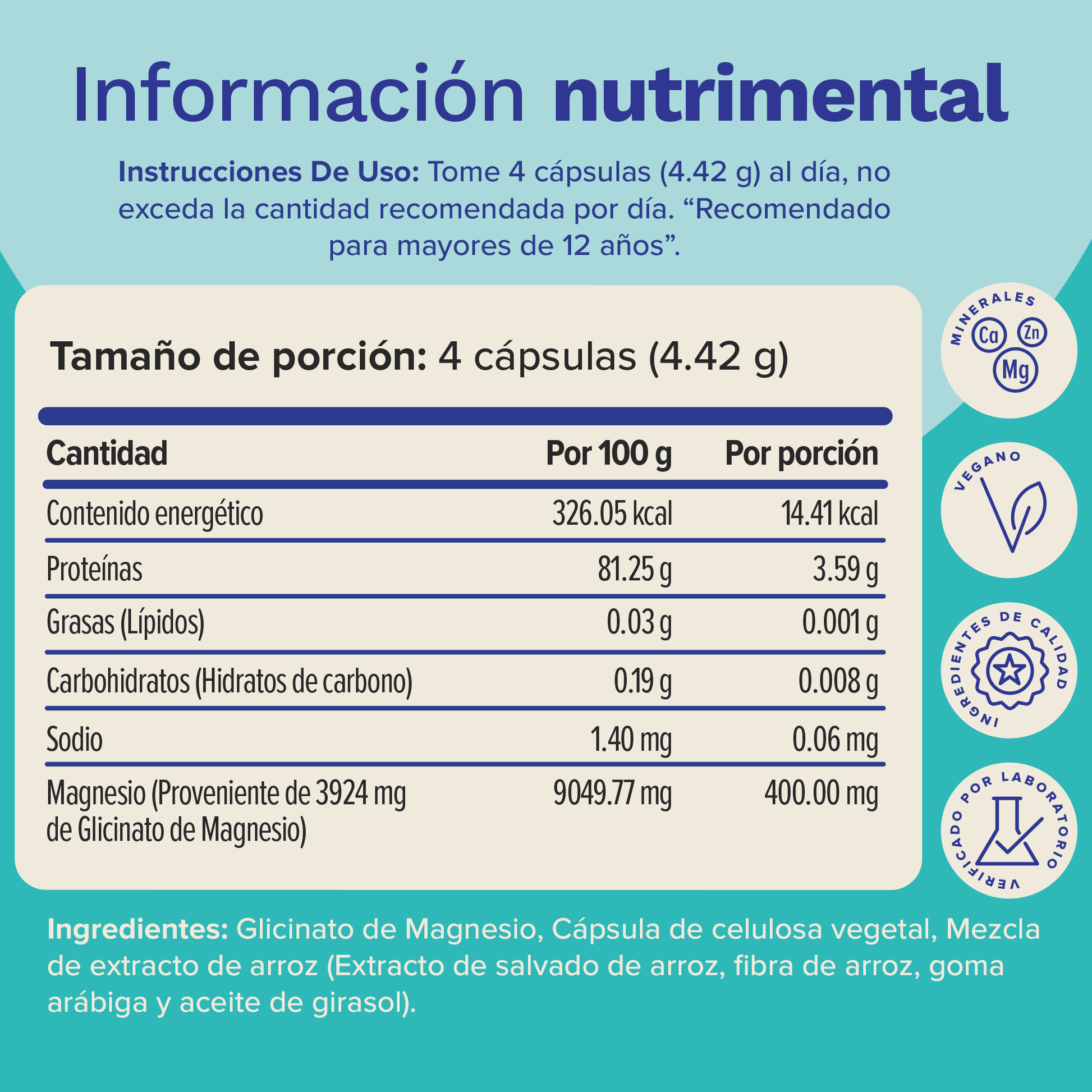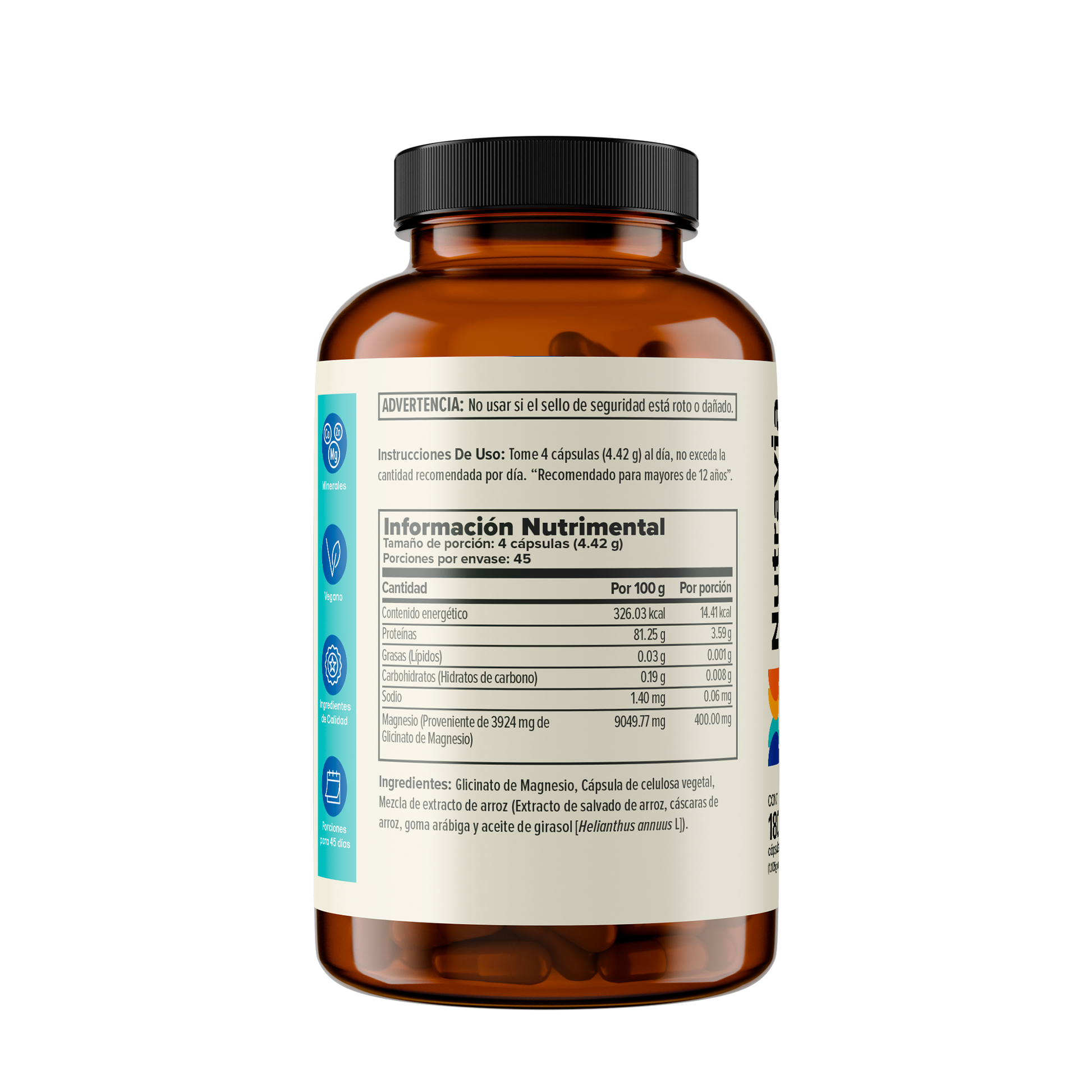 Glicinato de Magnesio de Nutravia, es una fórmula avanzada que proporciona 400 mg de Glicinato de Magnesio puro, sin ingredientes extras o rellenos (sin óxidos ni estearatos), cubriendo la ingesta diaria recomendada de éste mineral. Fórmula de alta absorción verificada por laboratorio. Contiene cápsula de celulosa vegetal con mezcla de extracto de arroz que asegura la correcta absorción y buen funcionamiento de nuestro suplemento. Nuestras cápsulas son 100% veganas, sin alergénicos o trazas.