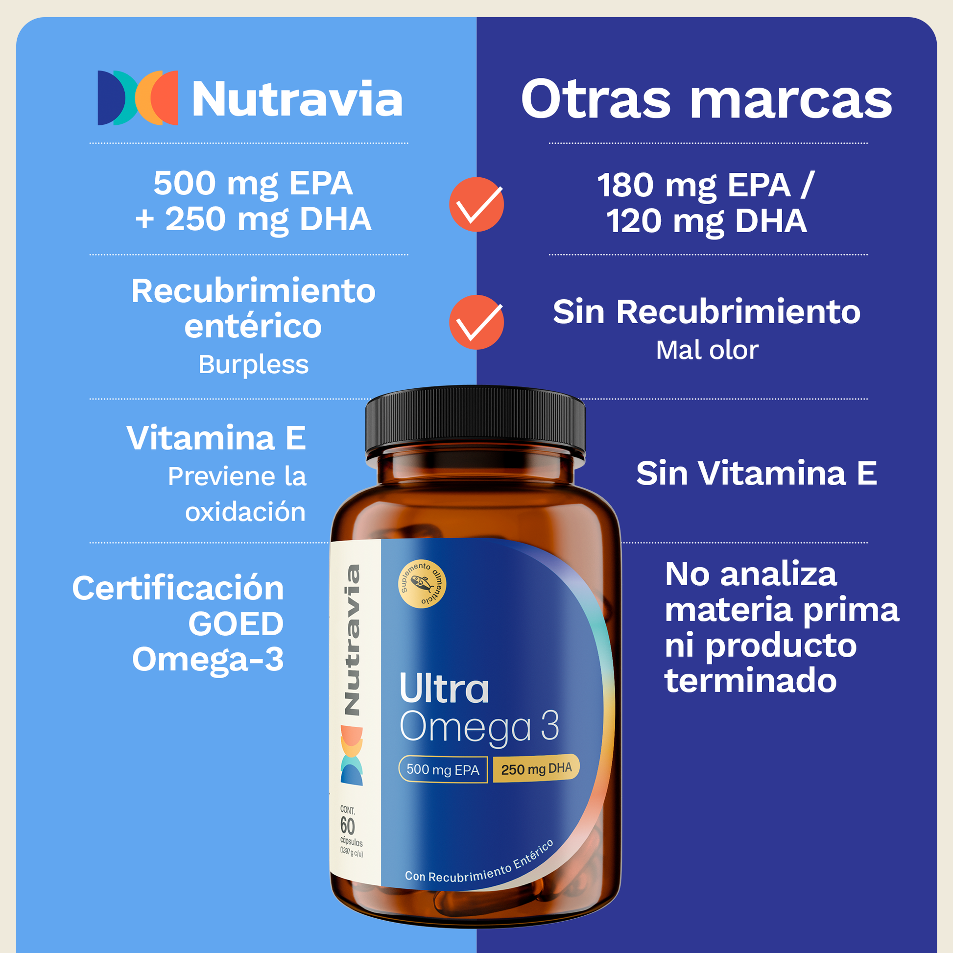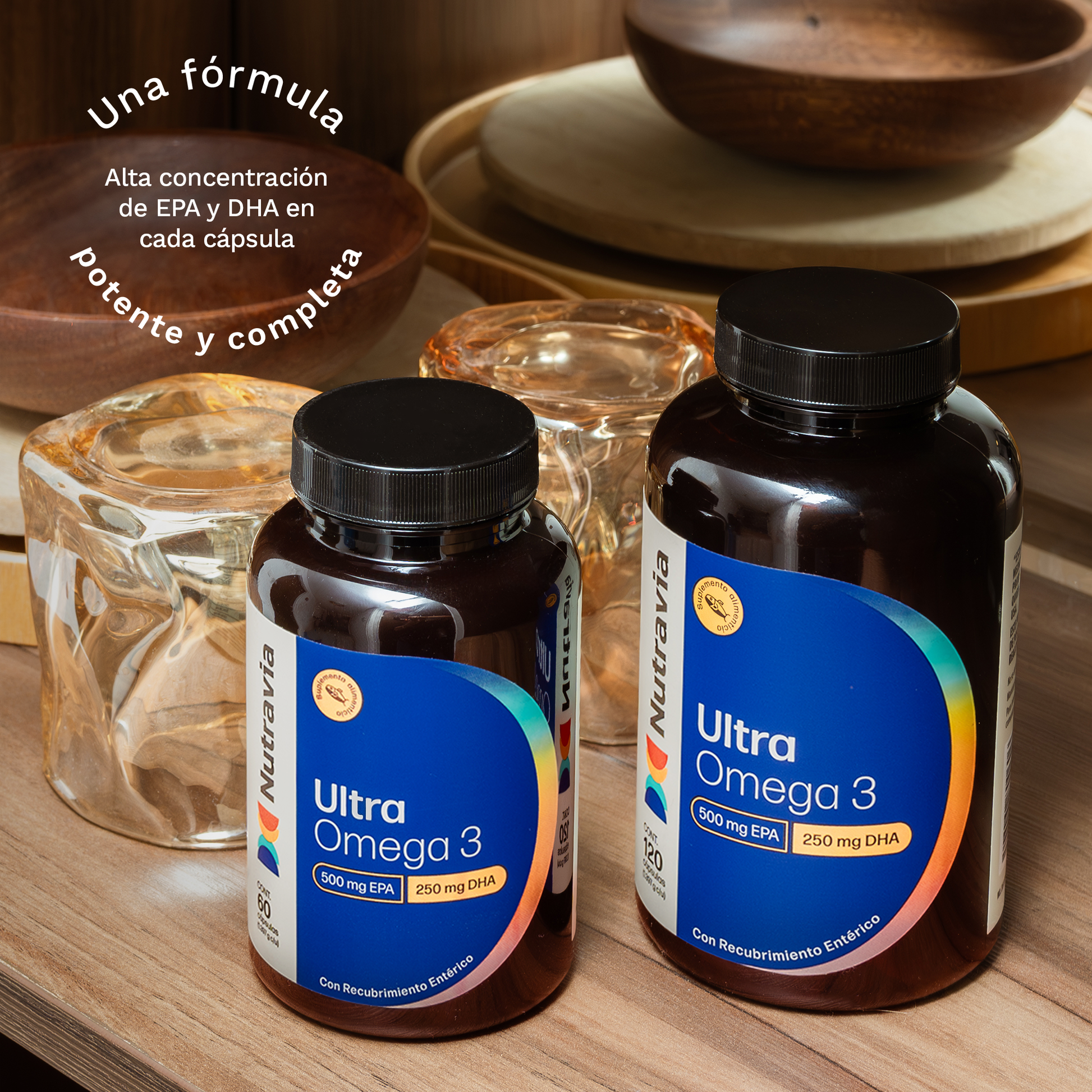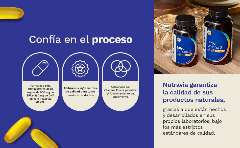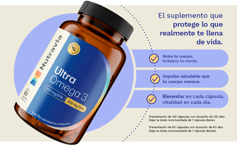 - Ultra Omega 3 de Nutravia, está formulado para suministrar la dosis segura de 500mg de EPA y 250 mg de DHA en solo 1 cápsula de gel.