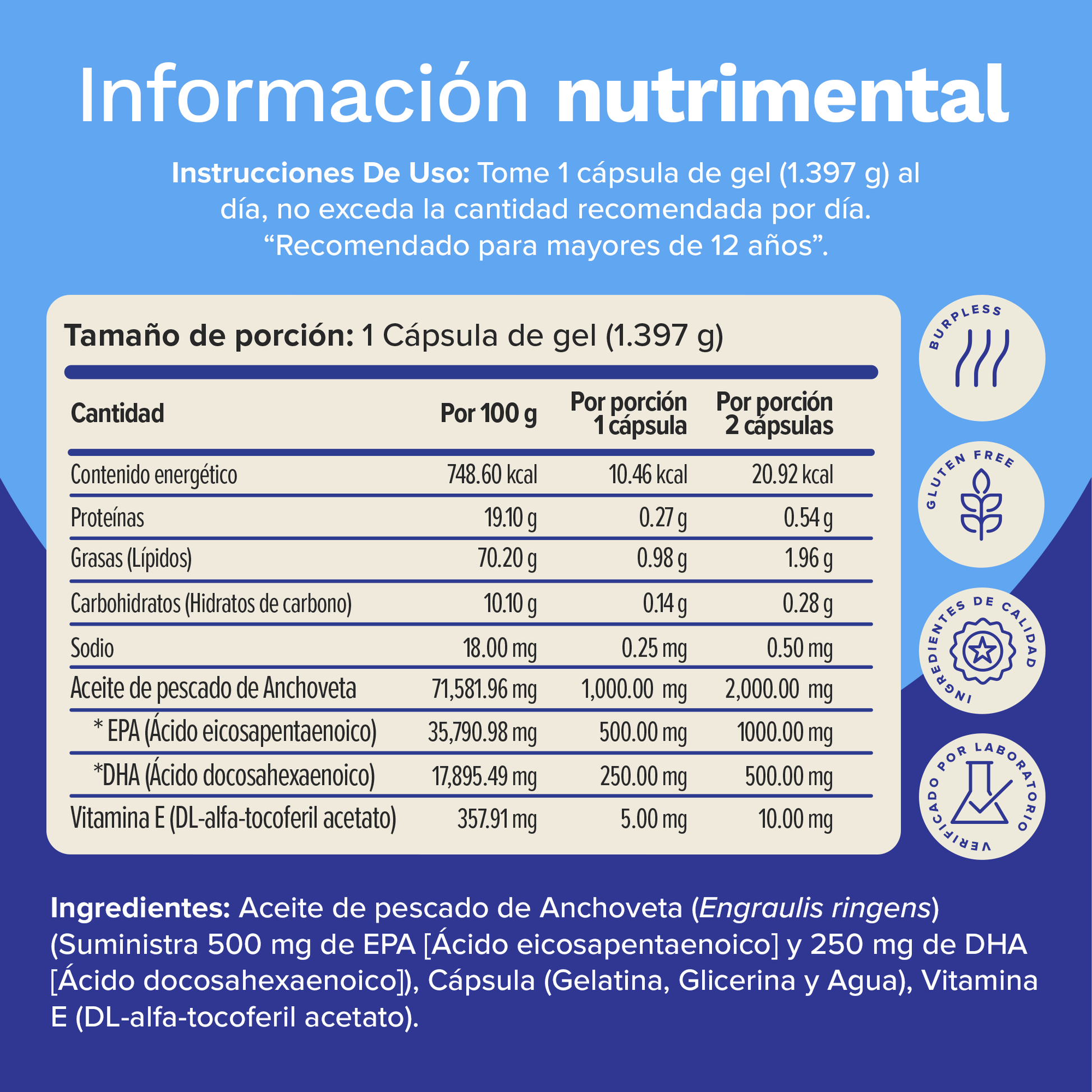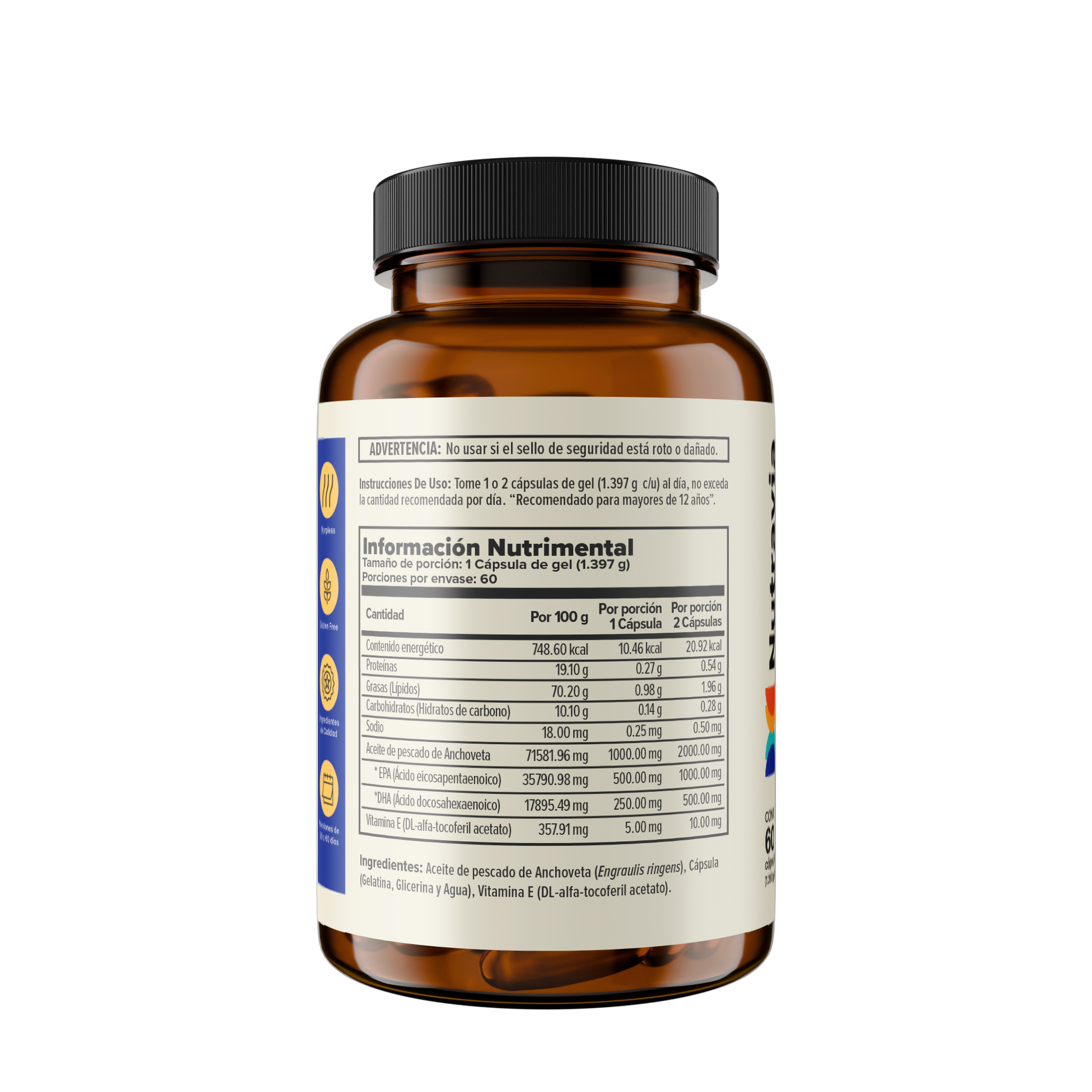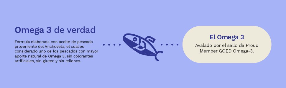 - Contiene aceite de pescado proveniente del Anchoveta, el cual, es considerado uno de los pescados con mayor aporte natural de Omega 3 por su menor tamaño y se clasifica como fuente segura por su bajo riesgo de bioacumulación de contaminantes.